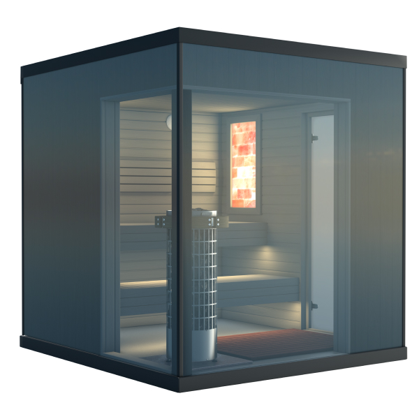 Fortgeschrittene belüftete Konstruktion, zwei hintergrundbeleuchtete Himalayasalz-Wände, LED-Beleuchtung, Bluetooth-Audiosystem, Harvia Cilindro 9kW Heizer mit WLAN-Steuerung