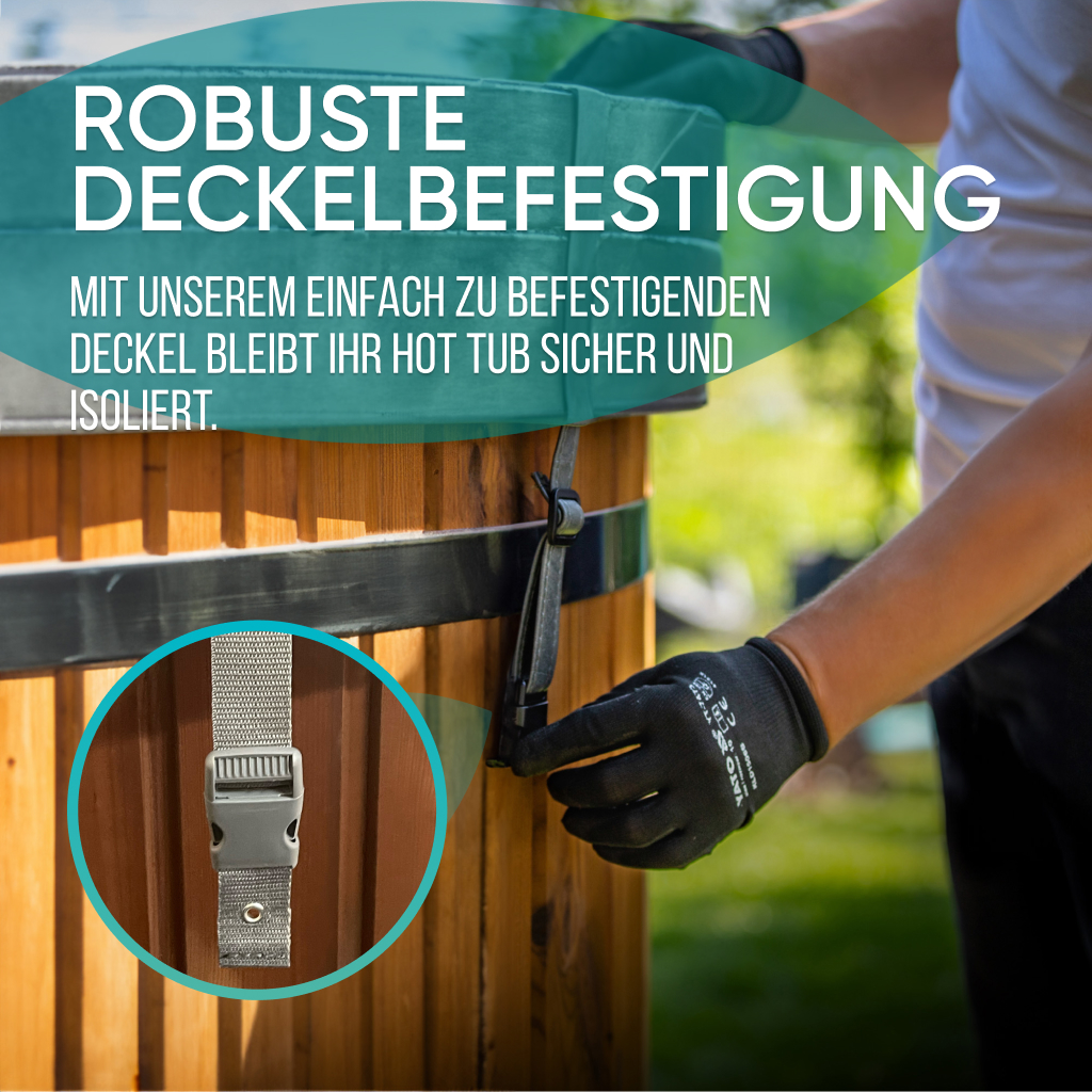 Vorkonfiguriert mit Premium Sandfilter, UV-C, 3kW und Massagesystem, 16 Hydrodüsen, 12 Luftdüsen, 10 Mini-LEDs. Mit Wärmedämmung.
