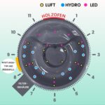 Rundes Filtergehäuse im neuen Design. Vorkonfiguriert mit Premium-Sandfilter, UV-C, 3 kW und Massagesystem, 16 Hydrodüsen, 12 Luftdüsen, 11 Mini-LEDs.