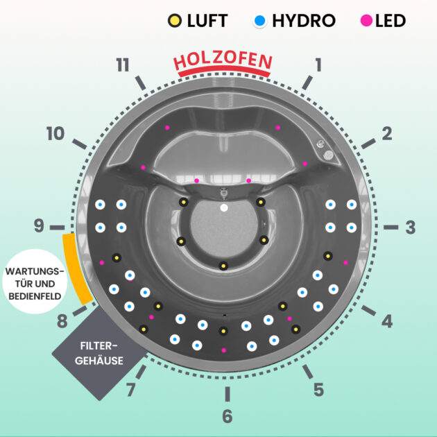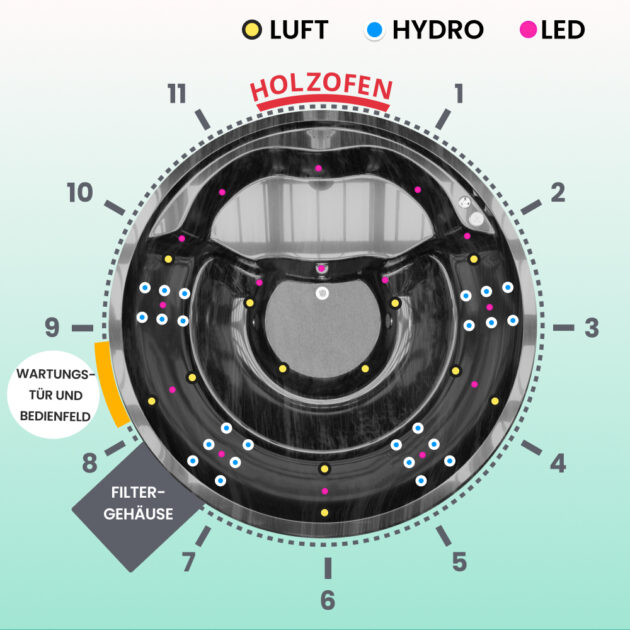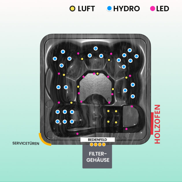 Für 6-8 Personen. 24 Hydrodüsen, 12 Luftdüsen, 11 Mini-LEDs.