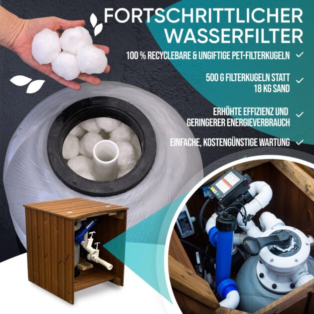 Die zu 100 % recycelbaren und ungiftigen PET-Filterkugeln sind eine äußerst effiziente und umweltfreundliche Methode, um das Wasser in Ihrem Hot Tub frisch und sauber zu halten. Je nach Nutzung müssen Sie die Filterkugeln nur einmal im Monat reinigen und alle zwei Jahre austauschen.