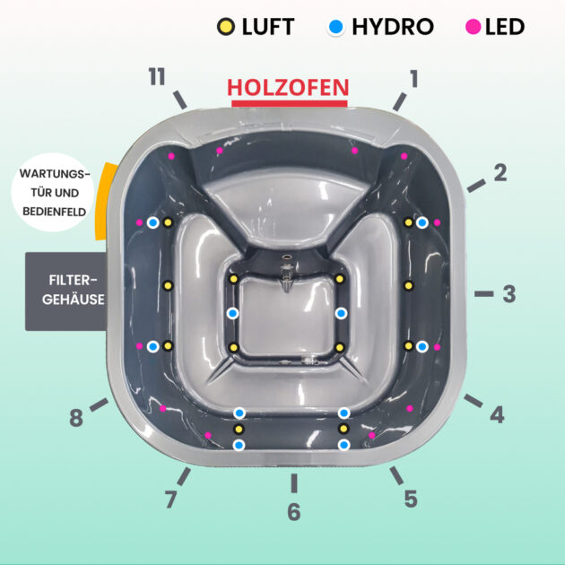 Für 4-6 Personen. 12 Hydrodüsen, 12 Luftdüsen, 10 Mini-LEDs.